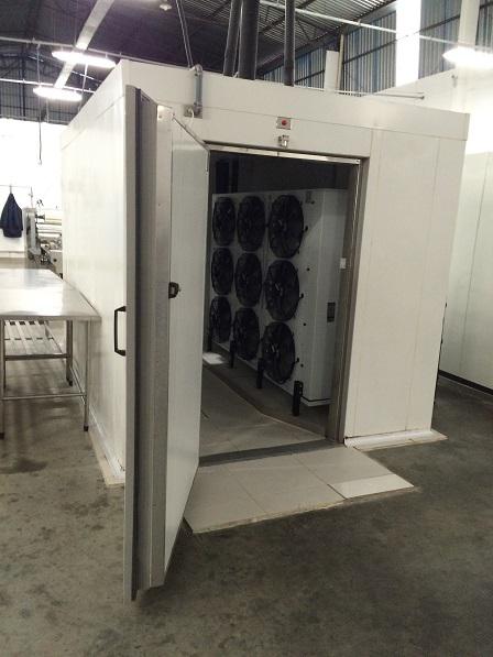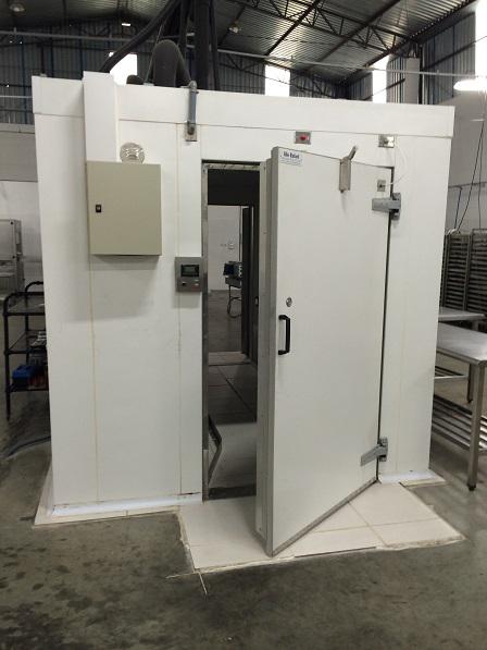 Ultra freezer modular com isolamento em poliuretano marca São Rafael. Dimensões: 2,5 x 3,70 x 2,40m. Ultra freezer revestido de placa pré-pintada, para congelamento rápido com temperatura de - 30º. Especificações técnicas: 01 (um) evaporador de 2,81 x 0,80 x 2,05 m e tensão 220 v; 01 (uma) unidade condensadora de 1,90 x 1,56 x 1,0 m, tensão 220 v; 09 (nove) motores ventiladores Ziehl-ABEGG Soprador. Equipamento seminovo.
