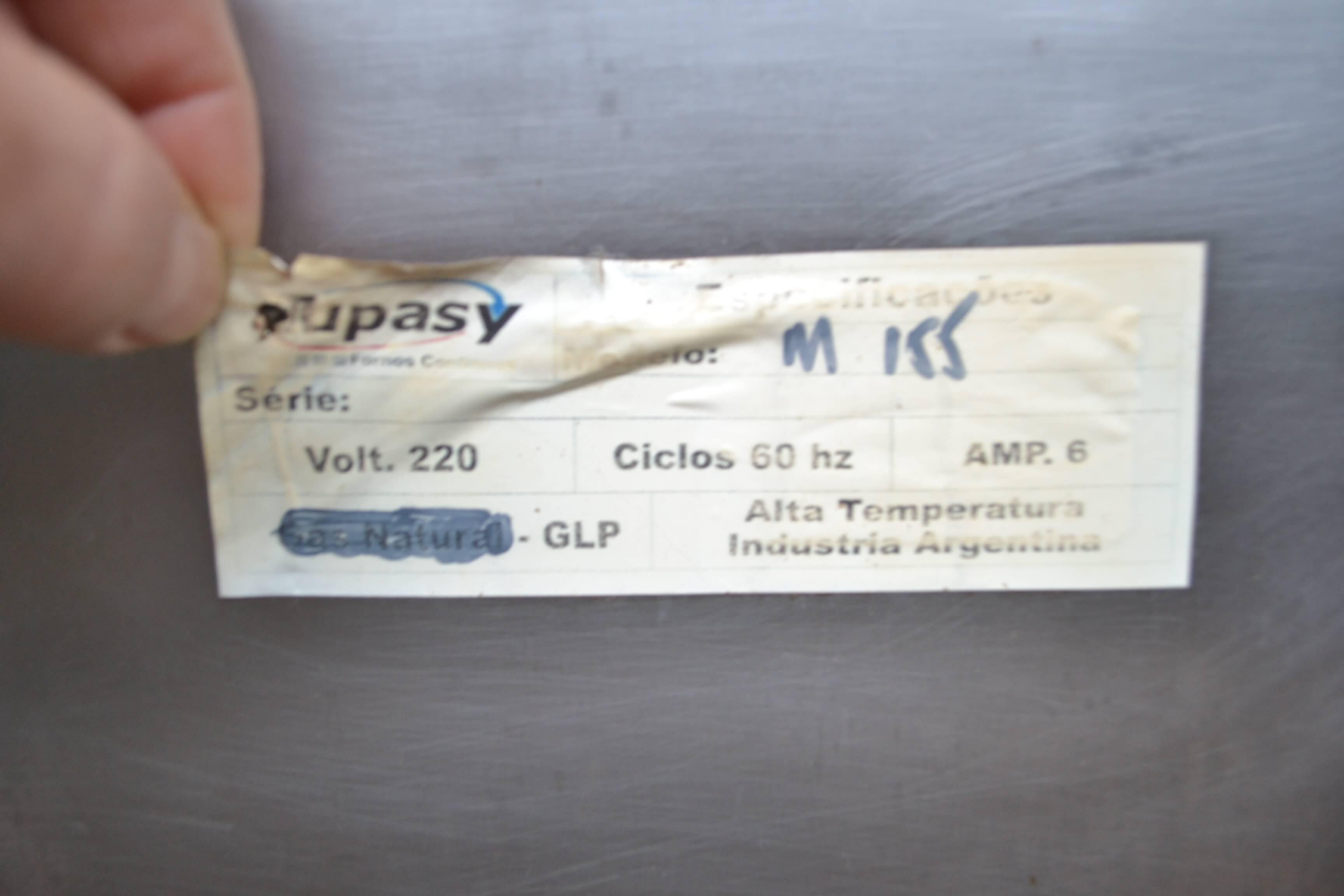 Forno de esteira para pizza e esfiha marca Tupasy. Modelo: M551. Equipamento fabricado em aço inox 304 (externo) e aço inox 430 (interno) com aquecimento à gás GLP, atingindo temperatura de 350 graus. Produção: 40 unidades/hora de massa crua; 60 unidades/hora de massa assada e 1350 unidades de esfiha/hora. Velocidade da esteira variável. Voltagem: trifásico/220 V. Dimensões: - Largura esteira: 550 mm - Comprimento: 1250 mm - Altura: 600 mm - Altura Total: 1050 mm.