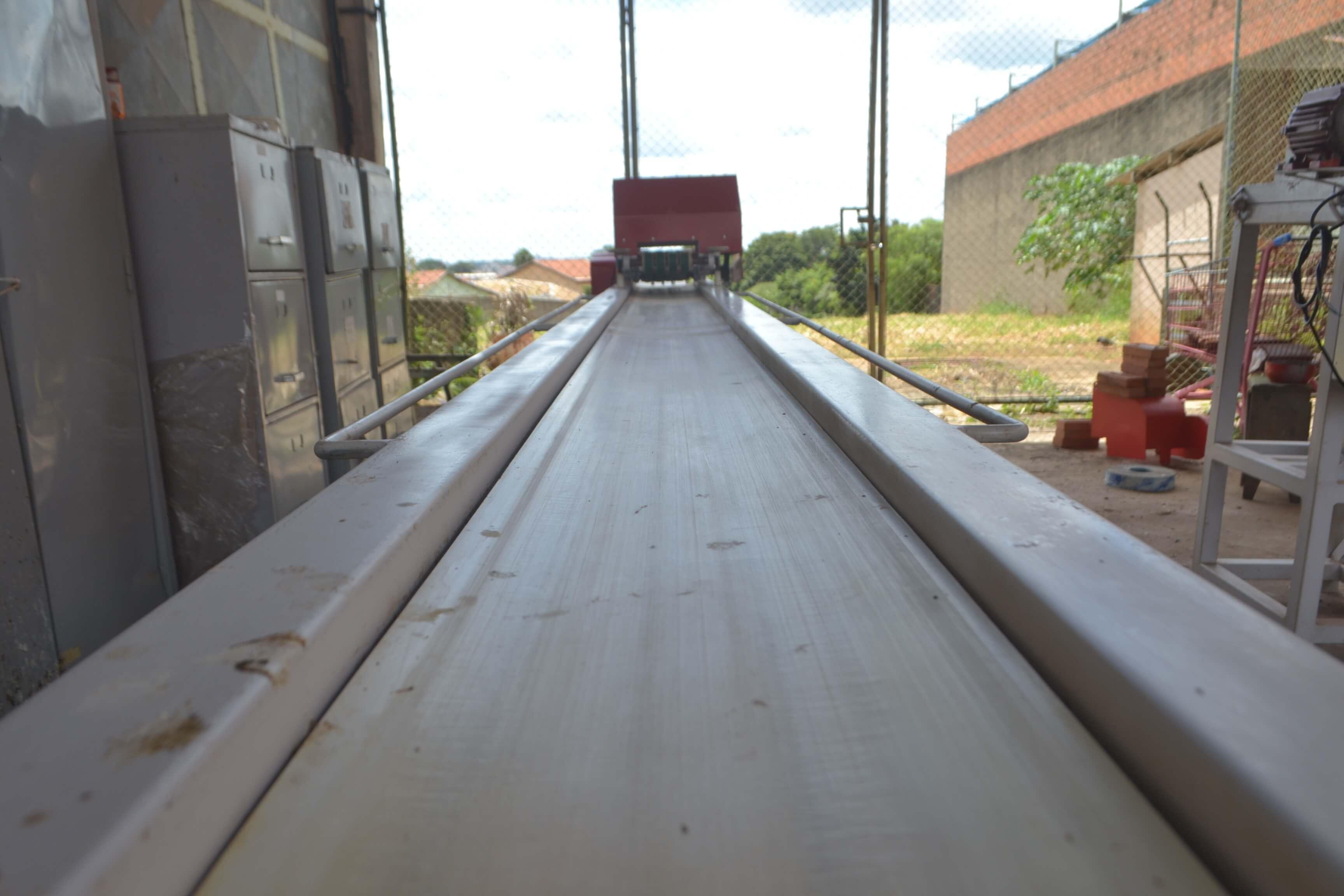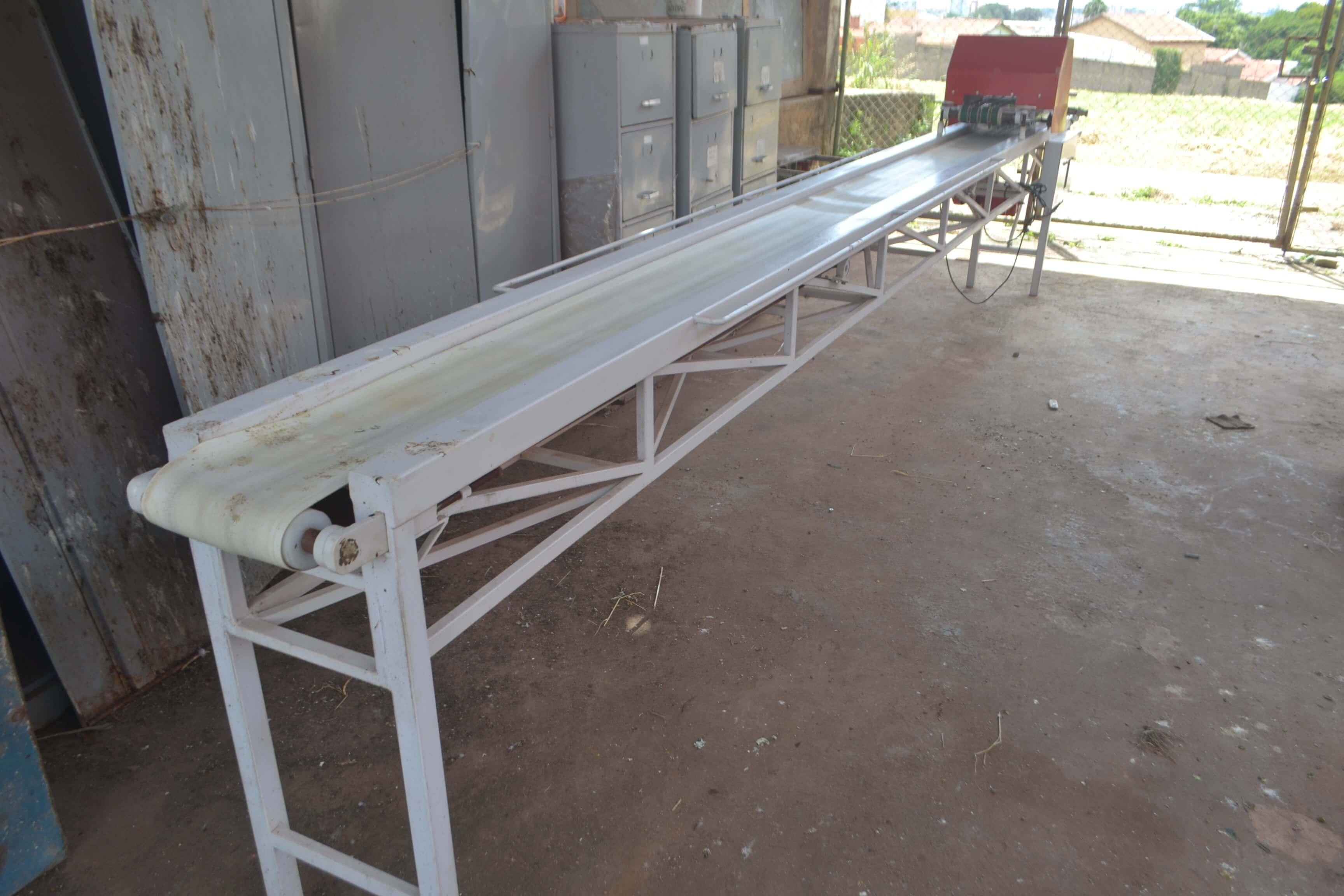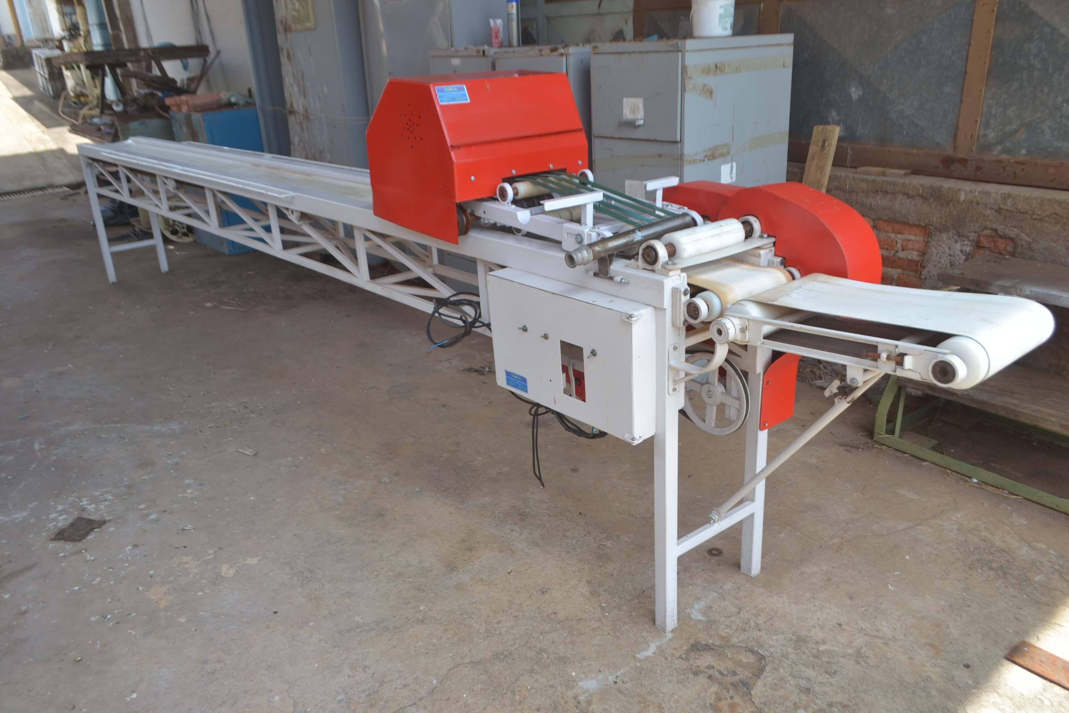 LINHA AUTOMÁTICA DE FABRICAÇÃO DE PÃO DE ALHO Linha automática de fabricação de pão de alho. Marca: Targa. Composta de divididora, modeladora, dosadora e alongadora. Capacidade de produção: 25 bandejas com cinco pães de alho/minuto. Dimensões da esteira: 6 m comprimento e 600 mm de largura.