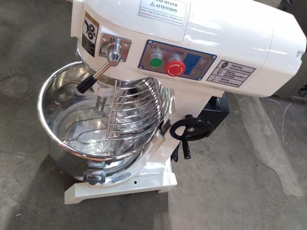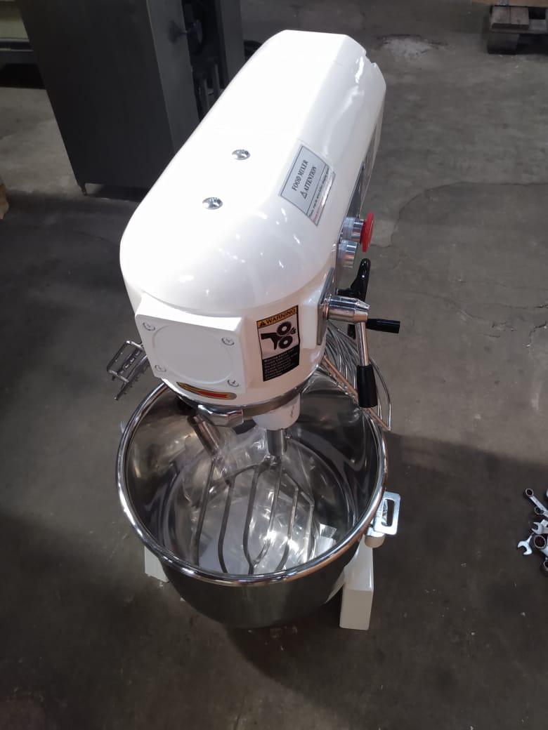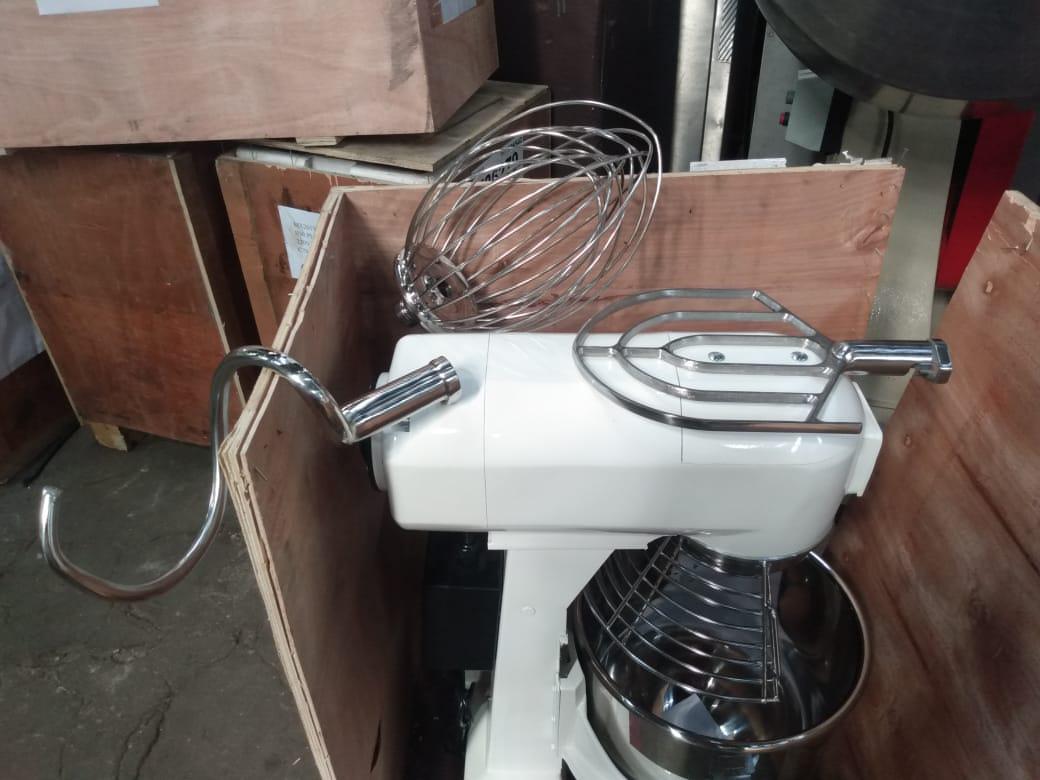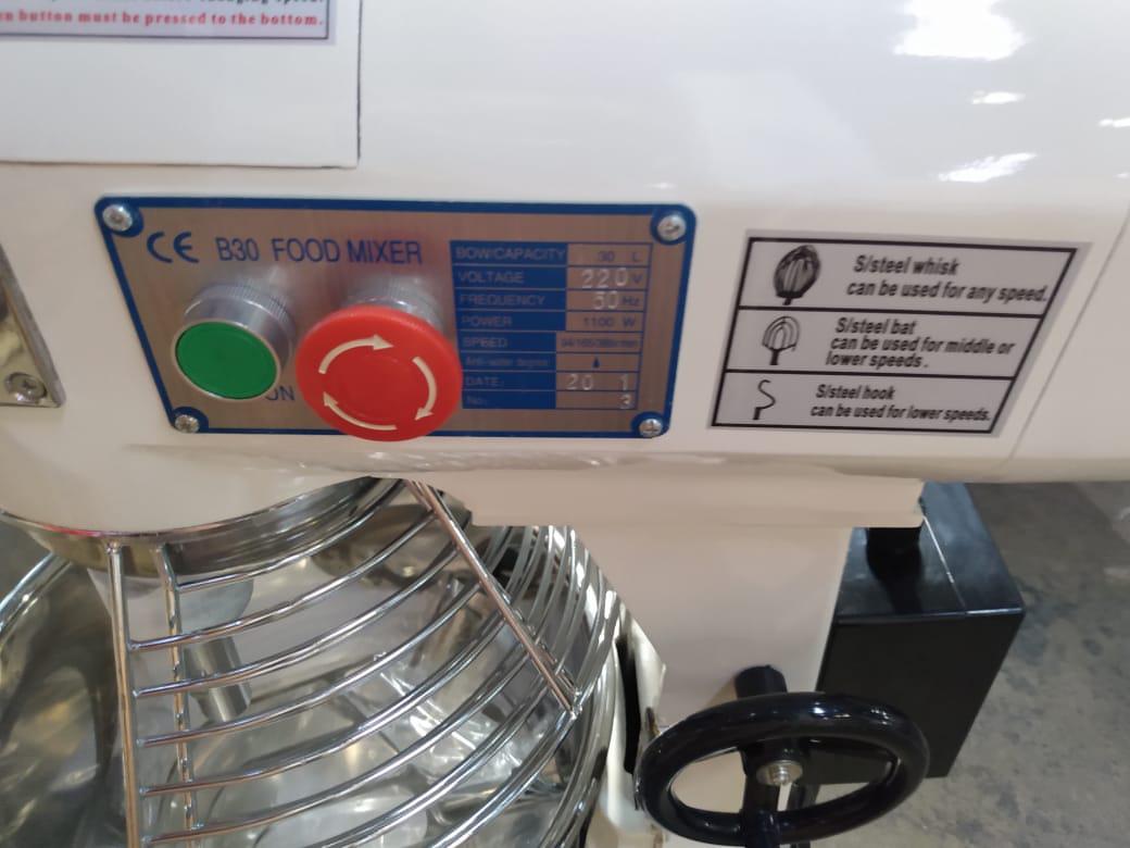 Batedeira capacidade 30 l. Equipamento com 3 velocidades e tacho e batedores (gancho, raquete, globo) em aço inox. Monofásica 220 v. Equipamento de origem chinesa (novo).