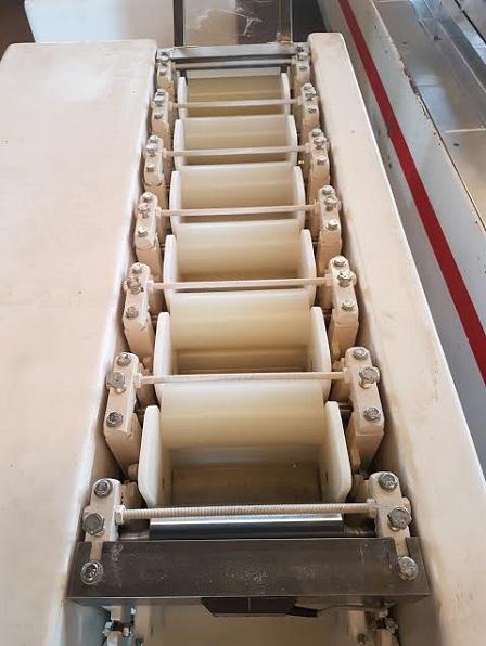 Cilindro conjugado de 7 rolos marca Toshiro. Motor: 2 CV, 4 P, 60 hz. Sistema de tração dos cilindros por engrenagem. Cilindros em nylon. Equipamento usado apenas para testes.