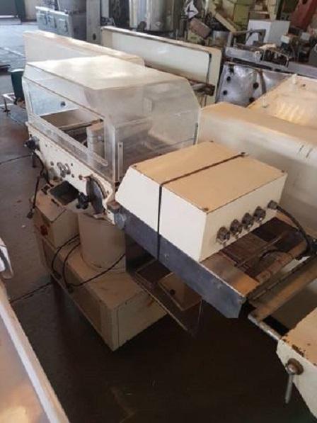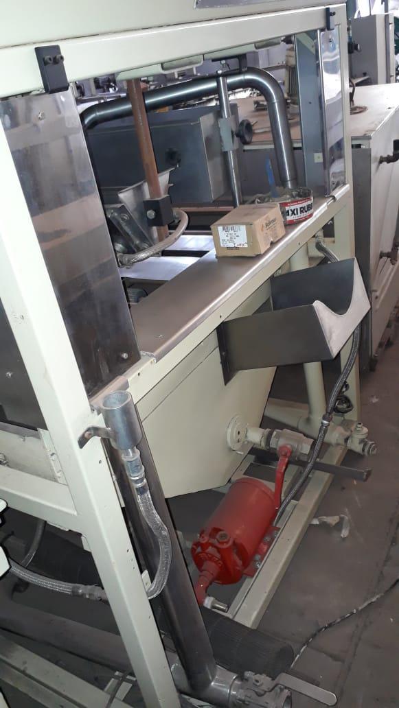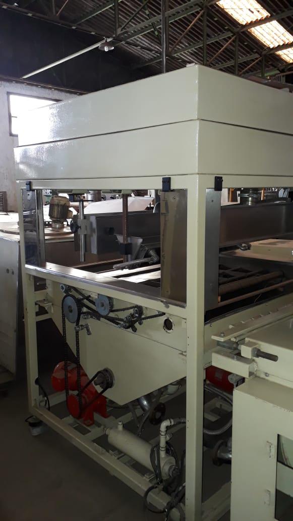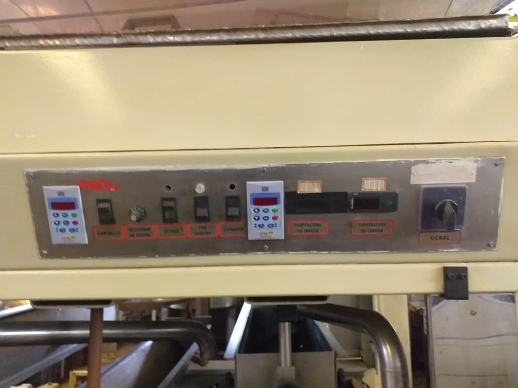 Cobrideira de chocolates marca Piróg 1 m. Equipamento com sistemas vibratório, de raspadores e tirador de 'rabichos'. Com bombas inferior (lóbulo) e de retorno (engrenagem) da massa e controlador de temperatura e aquecimento interno. Área de cobertura: 1 m.