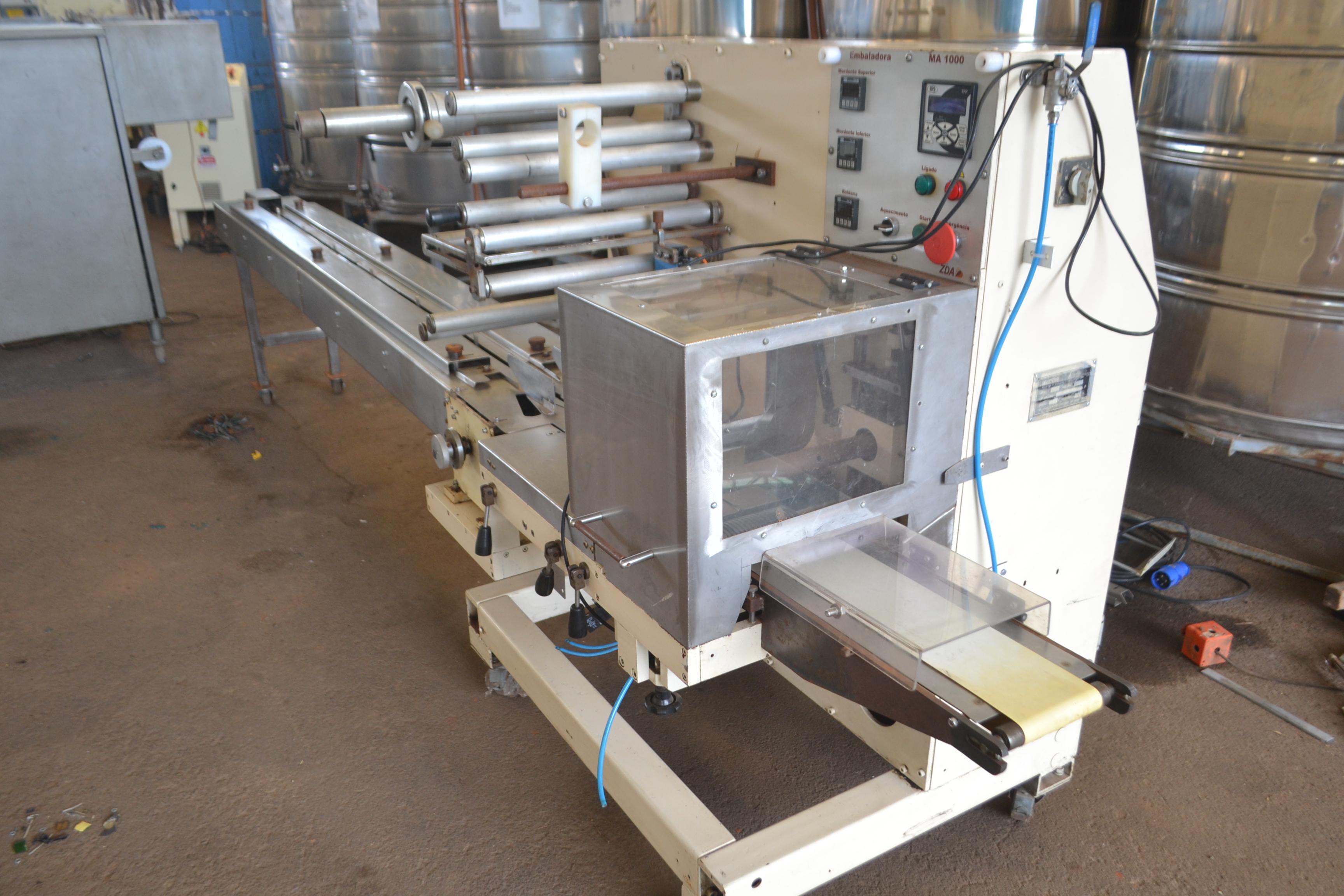 Embaladora flowpack marca Makweg para chocolates, doces e outros. Modelo: MA-1000. Produtividades: 80 unidades/ aproximadamente. Com CLP, fotocélula e mordente duplo. Dimensões: - Produção aprox.: 80 unidades/ min - Largura total: 1,00 m - Altura total: 1,50 m - Comprimento total: 4,50 m - Comprimento da esteira: 3 m.