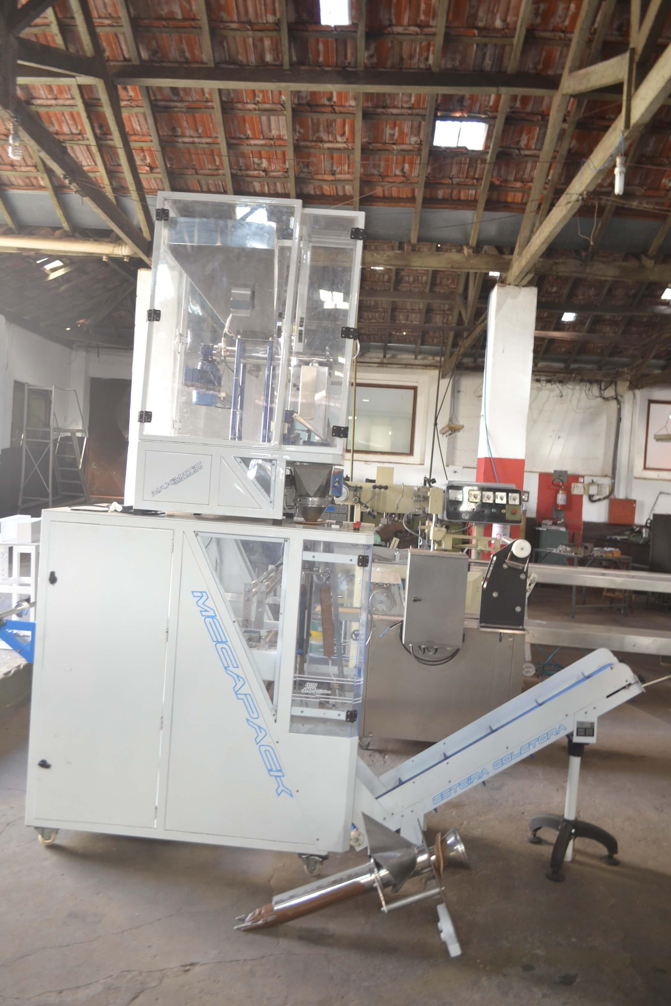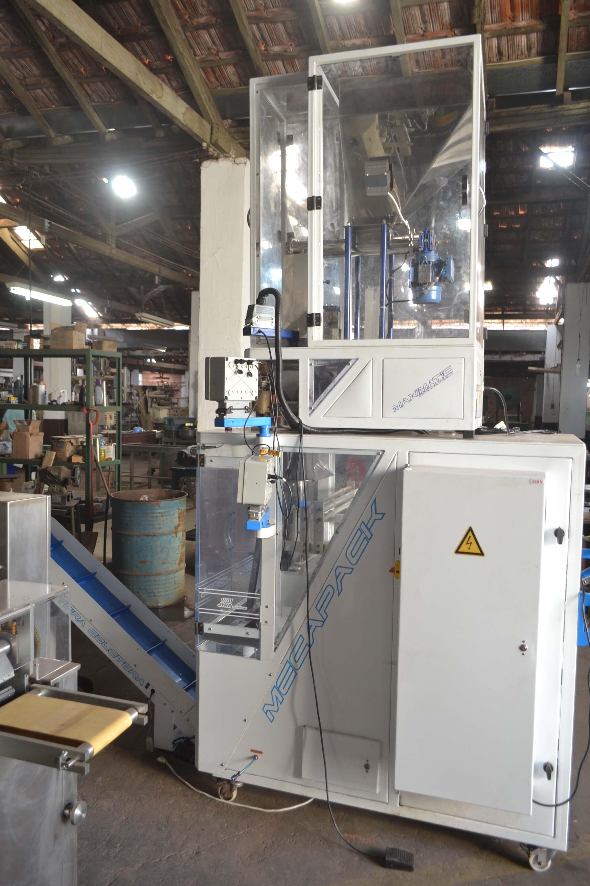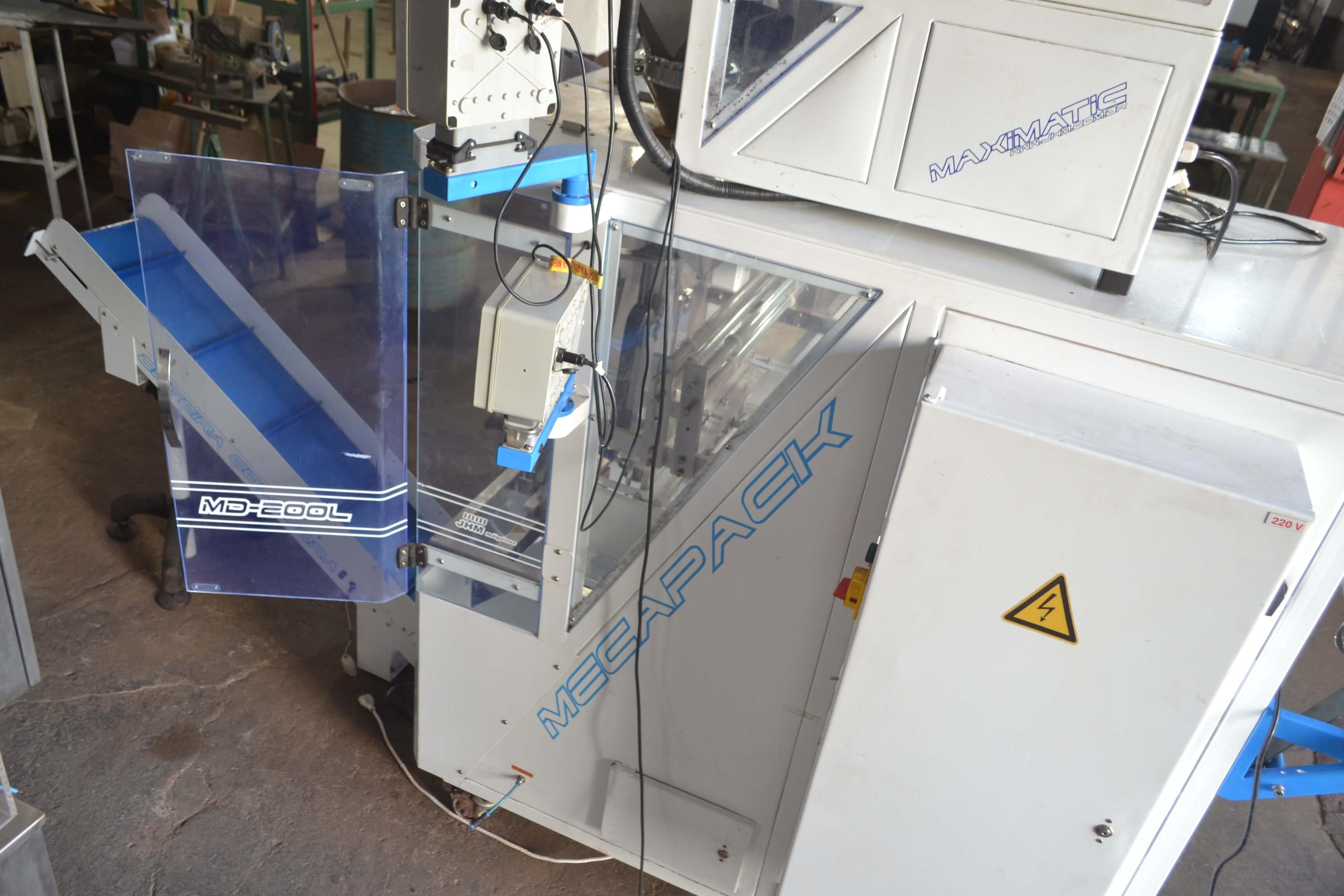 EMPACOTADORA AUTOMÁTICA PARA PÓS Empacotadora automática para pós. Marca: JHM. Modelo: Mecapack. Equipamento com alimentação automática preparado para embalagem de 3 soldas. Com tecnologia CLP (controlador programável em touch screen). Estrutura em aço carbono (epóxi). Acompanha 2 formadores. Equipamento seminovo. CaracterístIcas: - Altura: 1530 mm - Largura: 1100 mm - Comprimento: 1800 mm - Potência: 2000 Watts - Tensão: 220 Volts - 9A - Consumo: 1,5Kw/h - Peso aproximado: 220 kg - Normas utilizadas: NR-10 e NR-12 - Range: 20x50 mm até 200 x 360 mm (Largura x Altura) - Tamanho da gravação: 30 x 15 mm com Hotstamping - Tolerância: 3 mm