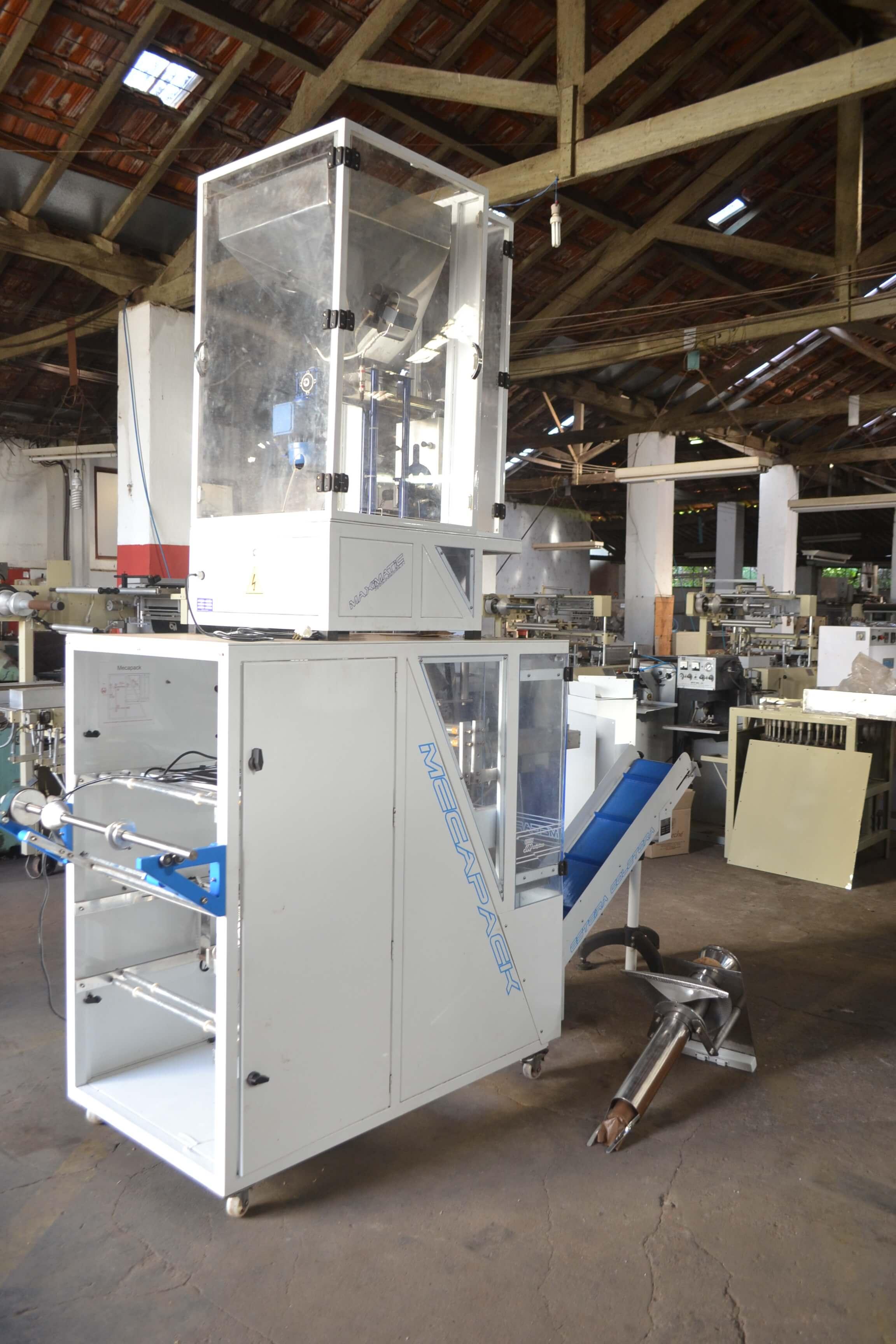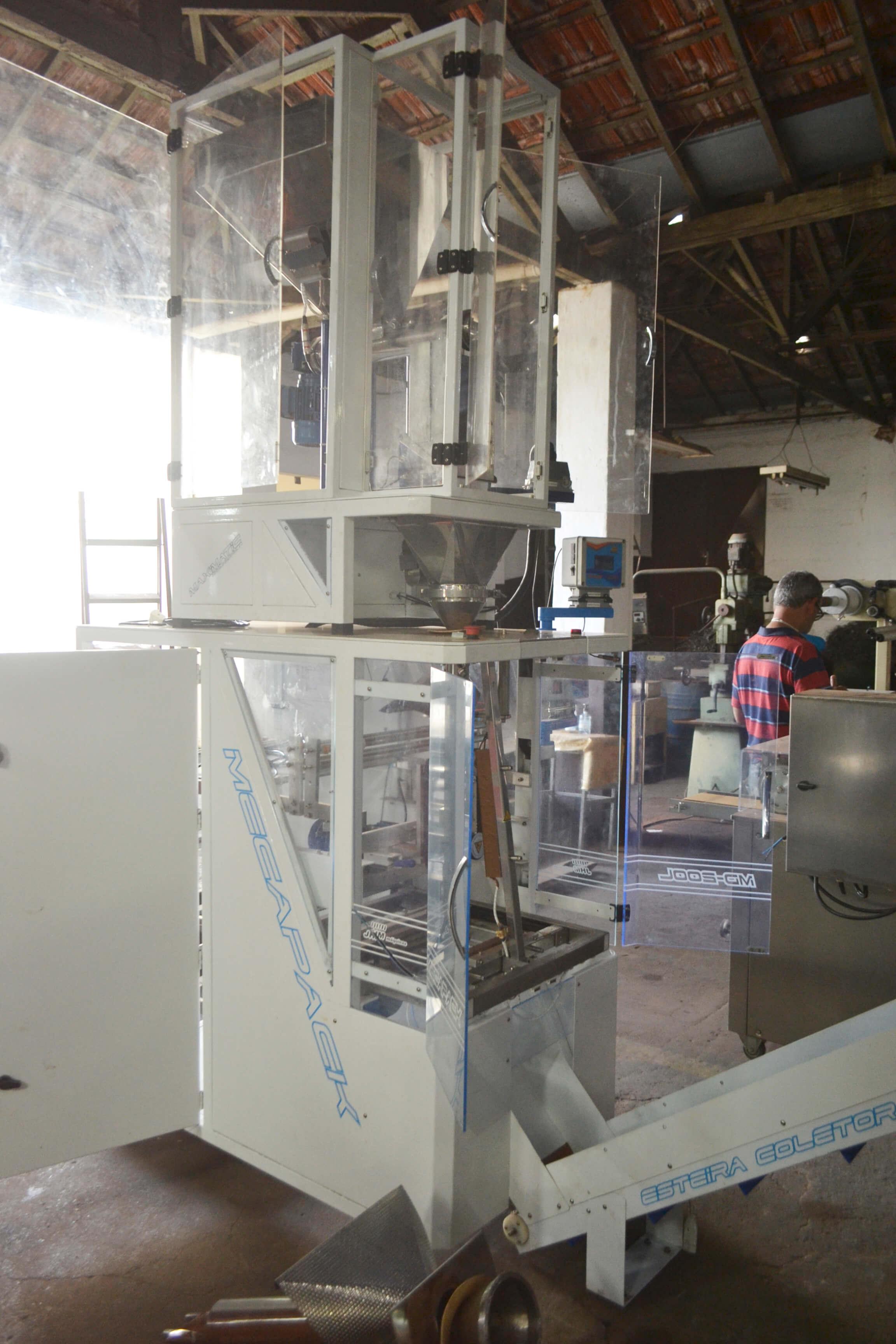 Empacotadora automática para pós. Marca: JHM. Modelo: Mecapack. Equipamento com alimentação automática preparado para embalagem de 3 soldas. Com tecnologia CLP (controlador programável em touch screen). Estrutura em aço carbono (epóxi). Acompanha 2 formadores. Equipamento seminovo.