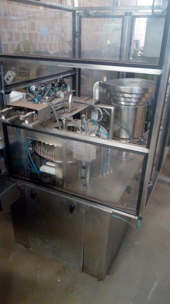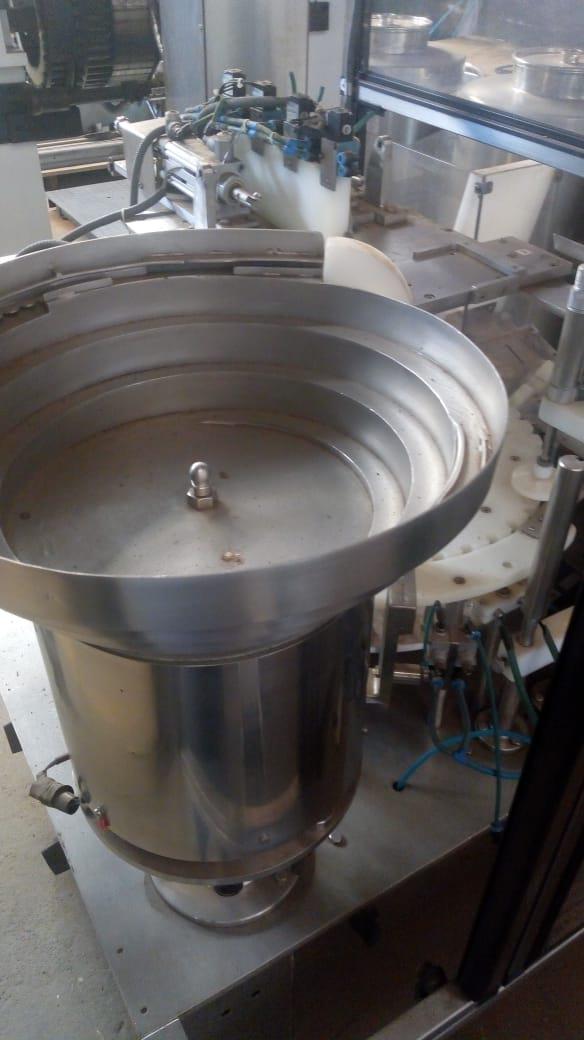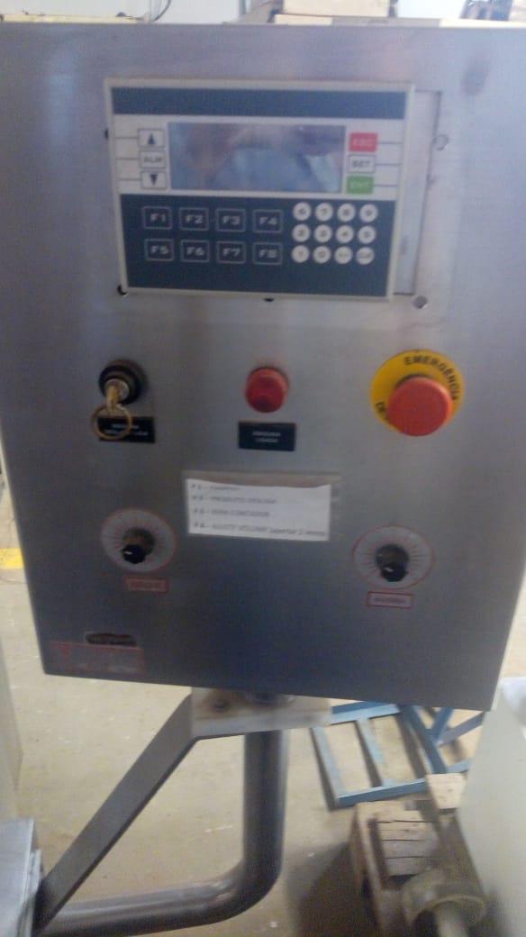 Envasadora rotativa em aço inox. Equipamento com sistema de envase e tampamento " batoque ". Marca: Wada.