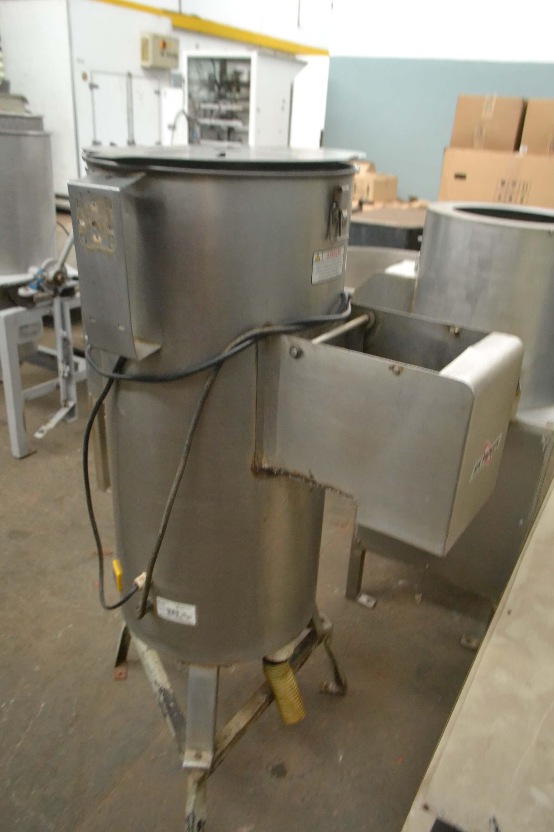 Linha de fabricação de batata chips capacidade 500 kg/h marca Skymsen + Sidtec. Preparada para batata ondulada. Composta de: - Descascador de Legumes - Fatiador de Batata Ondulada - Tanque de Lavagem - Centrífuga de Cesto para Água - Centrífuga de Cesto para Óleo
