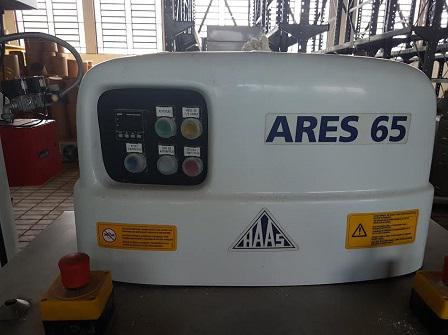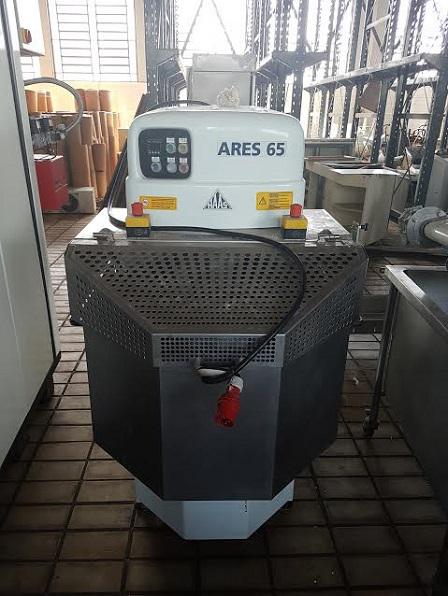 Masseira espiral semi-rápida marca Haas modelo Ares 65. Equipamento seminovo para 65 Kg, destinado a sovar e homogeneizar a massa, com braço de amassamento de configuração helicoidal que dispensa o cilindro após o processamento da massa. Dados Técnicos: Largura - 965 mm; Profundidade - 1.900 mm; Altura - 1.460 mm; Peso - 540 kg. Motor - Tensão: 3x220V; Potência: 7,5CV. Tempo médio: 12 min.
