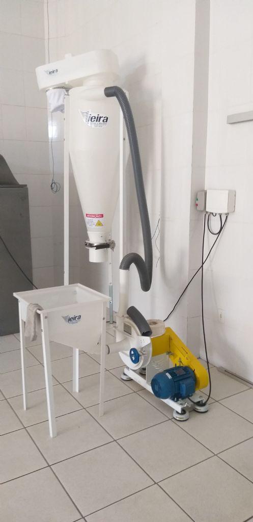 Moinho de martelo 30 Kg/h marca Vieira. Modelo: MSC 280. Equipamento em aço carbono com motor de 5 Cv, redução por correia A7, 6000 RPM, com silo e ciclone com filtro. Fabricação: 2019.