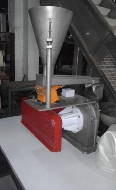 Moinho universal em aço inox Netzsch com silo e calha vibratória com motor de 3 CV.