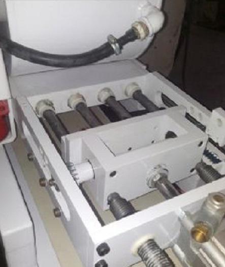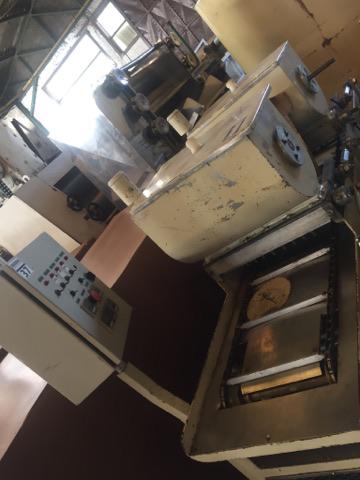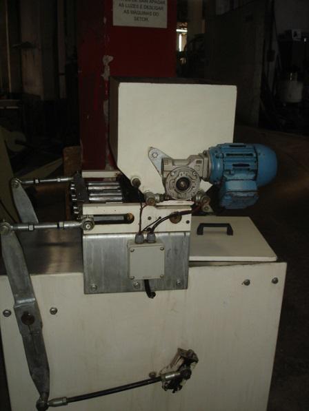 Pingadeira para chocolate marca Jcmaq, com 10 bicos para sistema contínuo de produção. A forma entra pela frente do equipamento e sai pelo seu fundo, já podendo entrar diretamente no túnel de resfriamento.