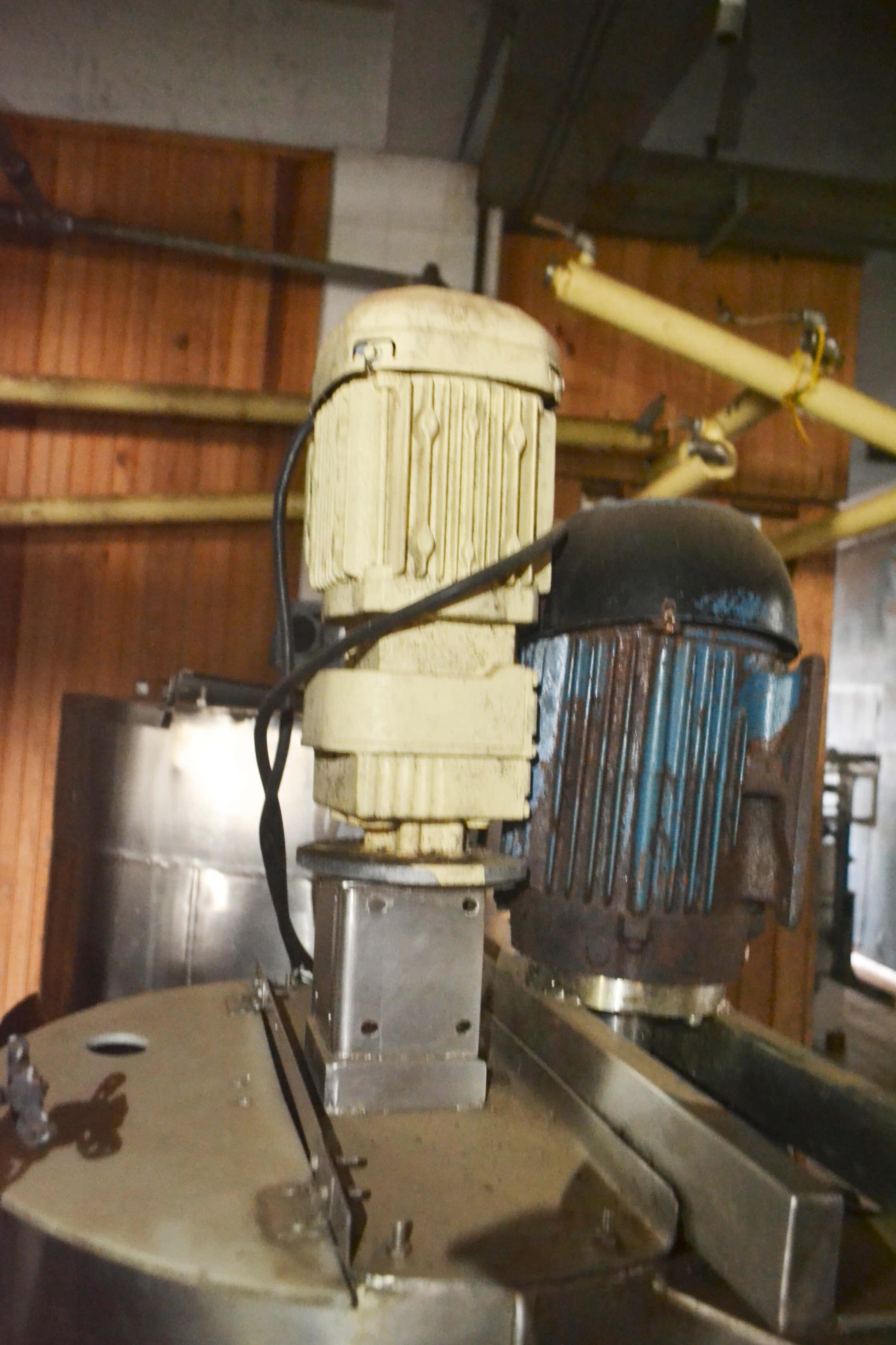 Equipamento encamisado, à vapor, com camisa externa em aço carbono e interna em aço inox. Com mixer para emulsificação do produto e mexedor.