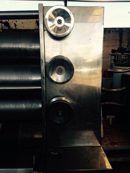 Refinador de 5 rolos, marca Jaf Inox. Equipamento em aço inox. Medidas dos rolos: 0,80 de comprimento X 1,50 de diâmetro.