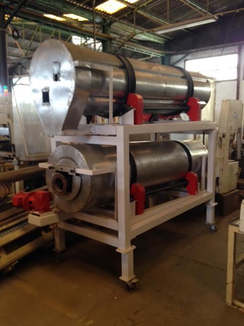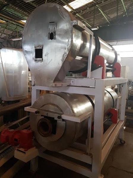 Secador Temperador rotativo contínuo, para snacks spandidos, marca Inbramaq. Constituído em aço inox 304 com estrutura em aço carbono.Medidas cilindros: 600 mm de diâmetro x 2 m de comprimento.