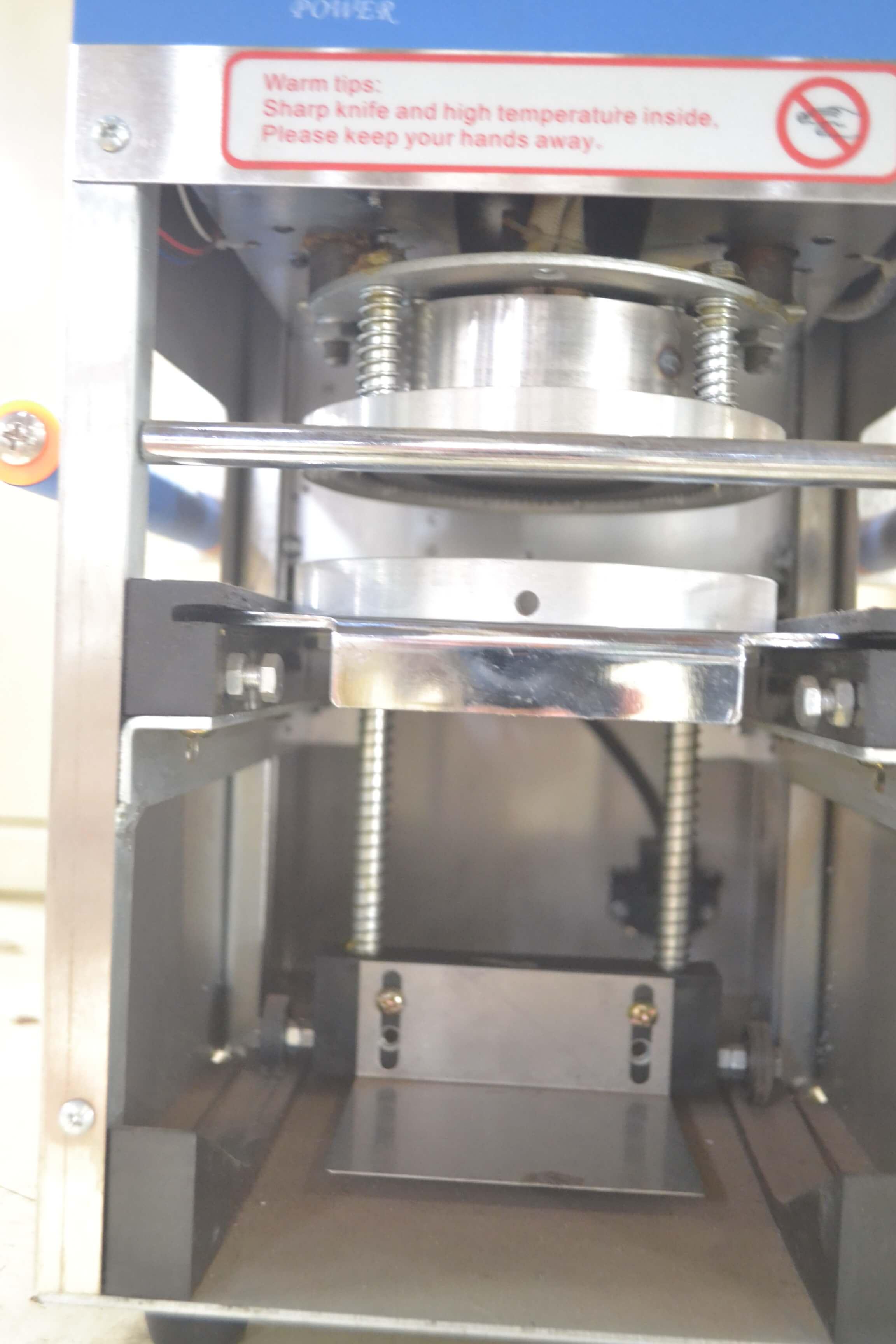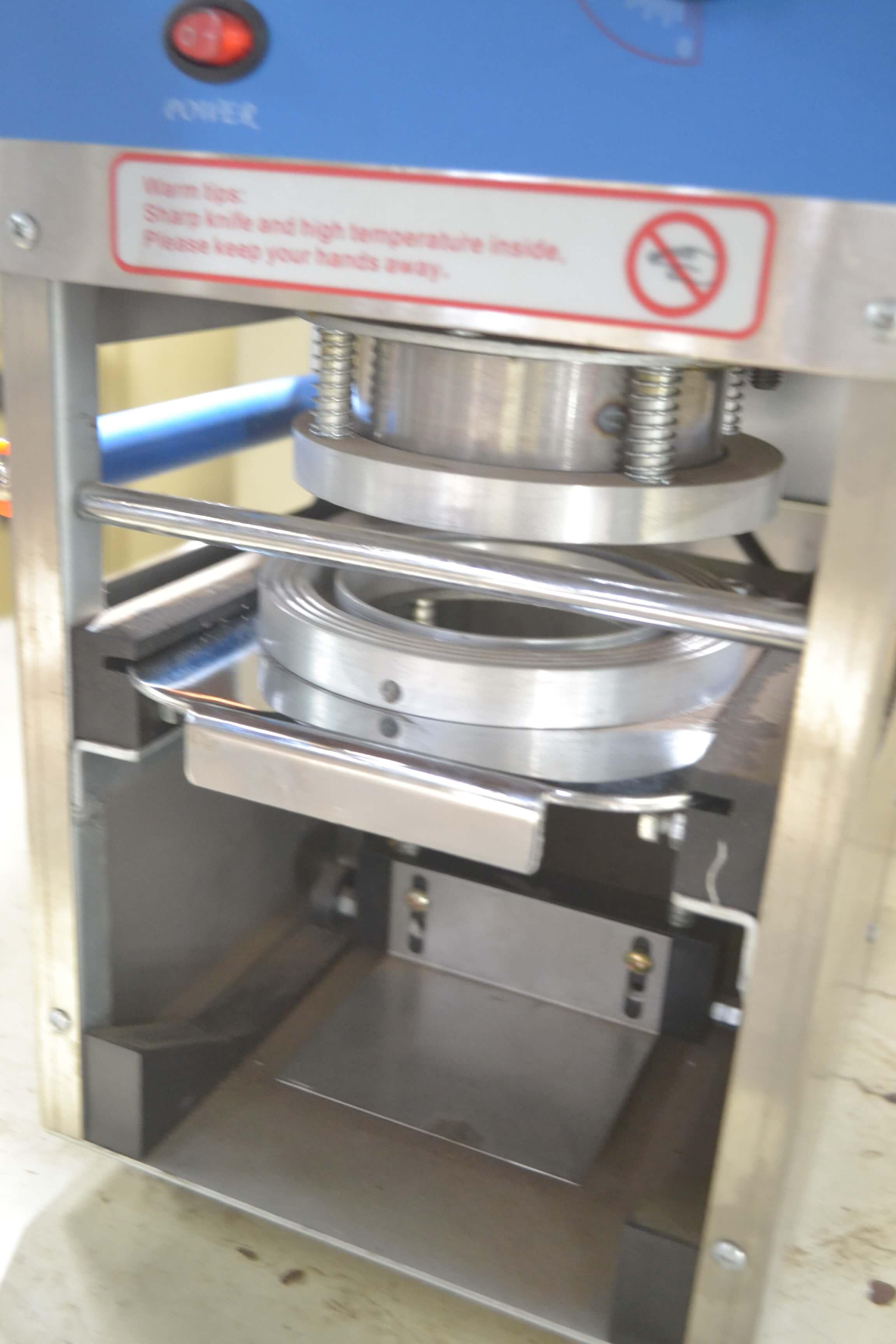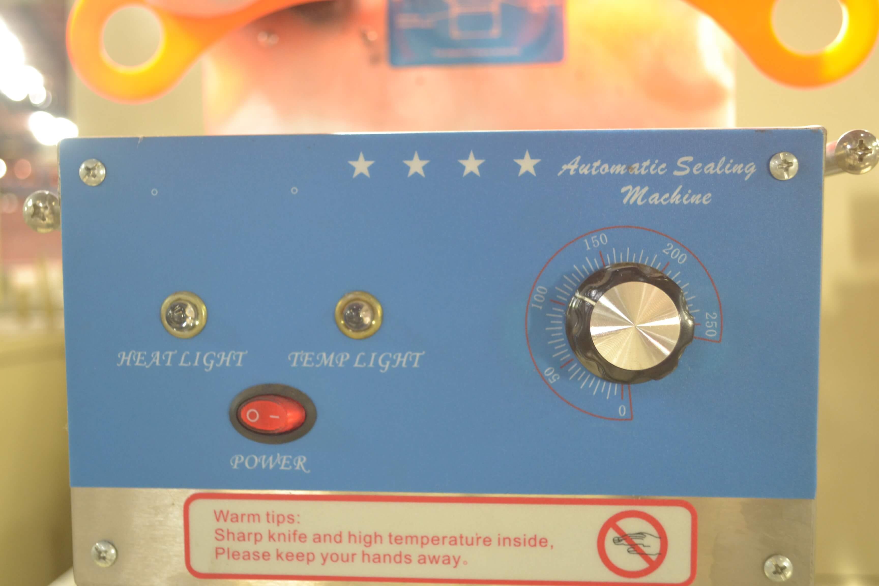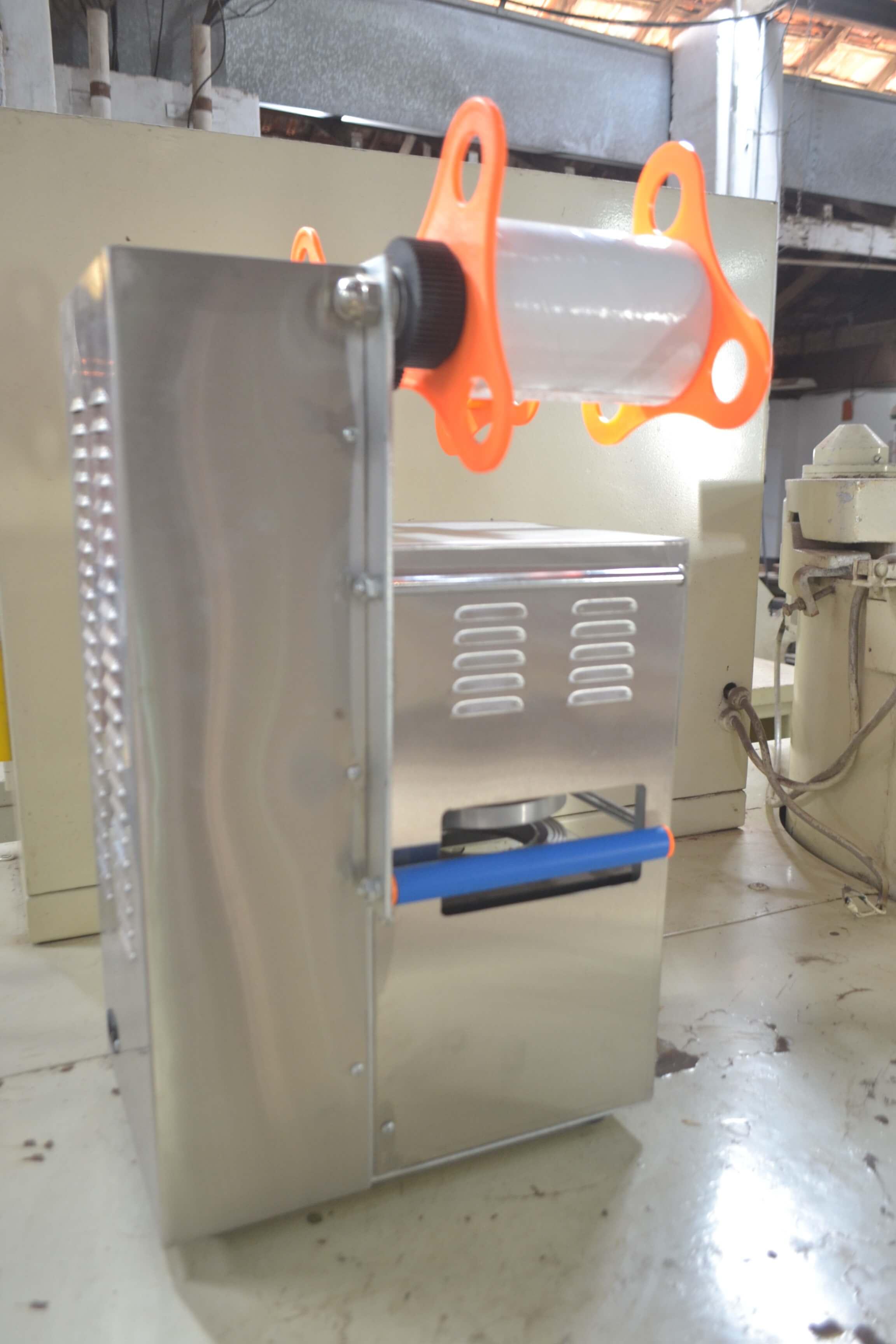 Seladora semiautomática de filme plástico para potes. Diâmetro pote: 95 mm. Voltagem: 220 V Monofásico. Marca: Cup Sealer Machine (origem - China) Dimensões do Equipamento: - Comprimento: 410 mm - Largura: 350 mm - Altura: 620 mm