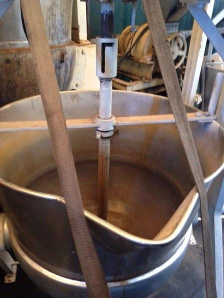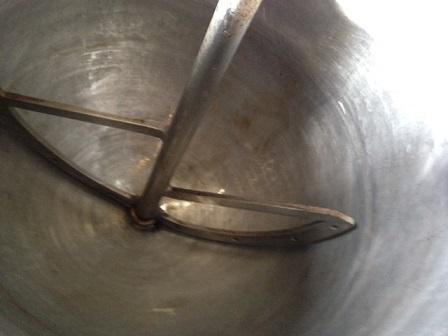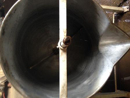 Tacho aberto, em aço inox, basculante, encamisado, com capacidade de 200 litros.