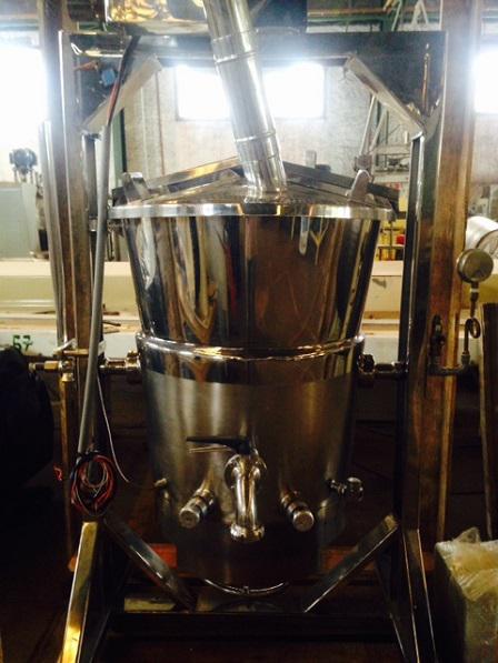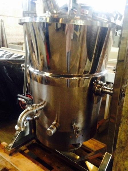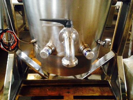 Tacho em aço inox grau sanitário com capacidade de 250 litros, com funcionamento à gás, à vapor e elétrico. Equipamento basculante, com registro de saída pela parte traseira. Acompanha painel elétrico. Tacho novo.