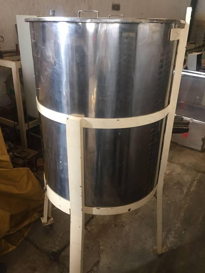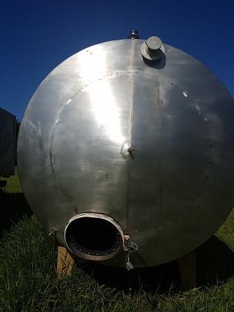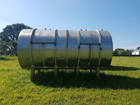 Tanque de armazenamento horizontal com capacidade para 20 mil litros. Equipamento em aço inox, com pés em aço carbono. Dimensões: comprimento - 5,30 m; diâmetro - 2,50 m; espessura chapa - 2,5 mm.