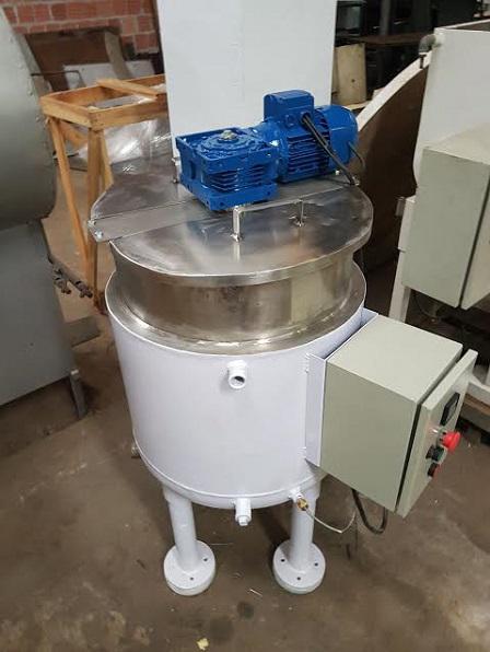 Tanque de derretimento de chocolates com capacidade de 115 litros. Equipamento encamisado, autônomo, em aço inox 304. Totalmente retrofitado.