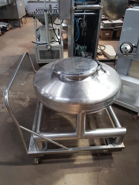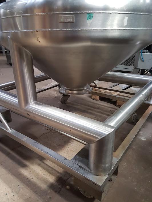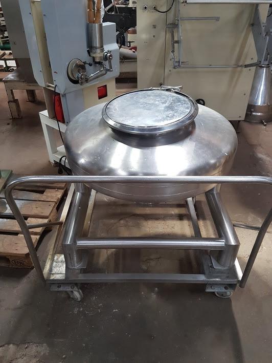 Tanque de transferência (Bin) 50 litros. Utilizado para operações de armazenamento temporário entre etapas de processos. Equipamento em aço inox total, com camisa simples.
