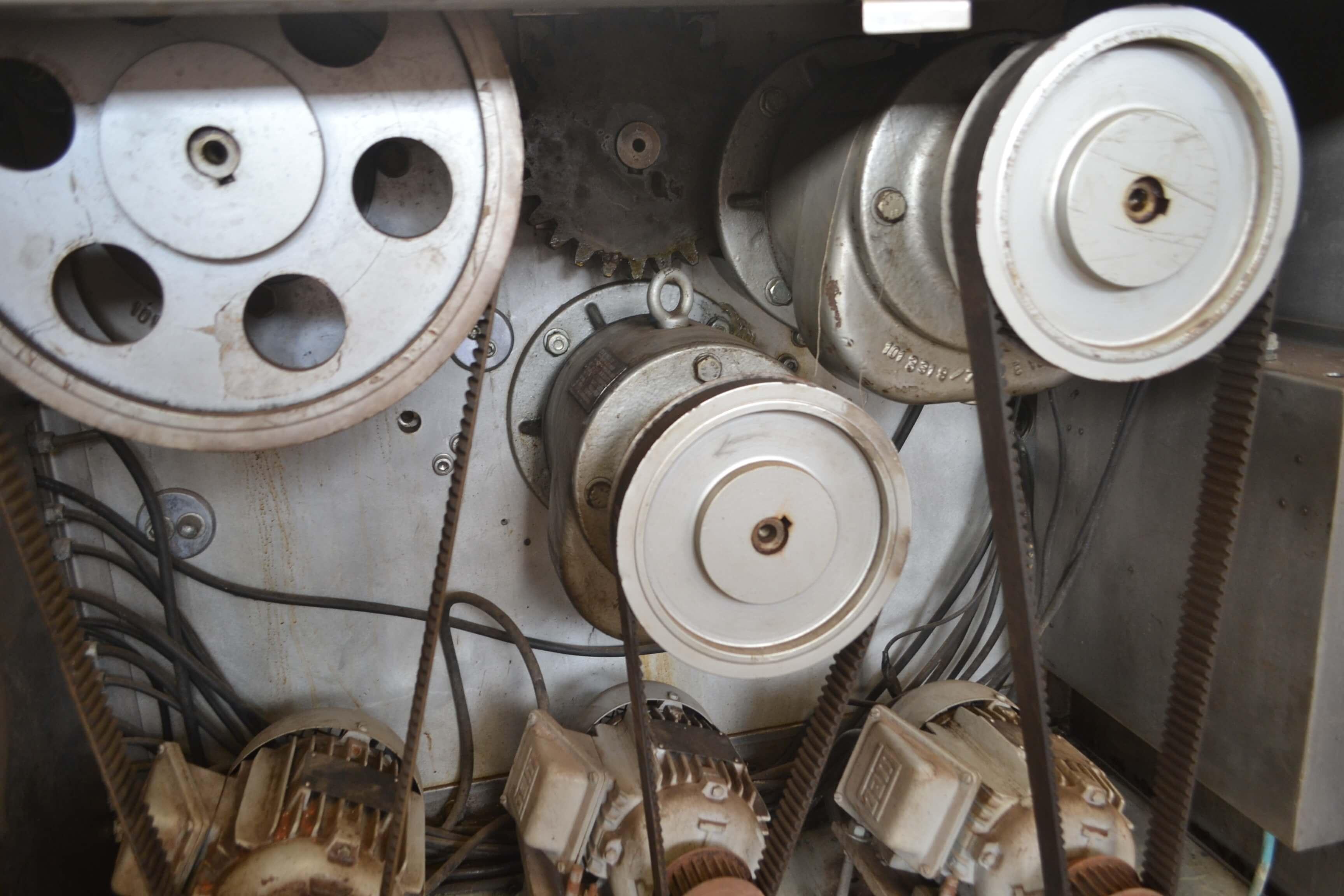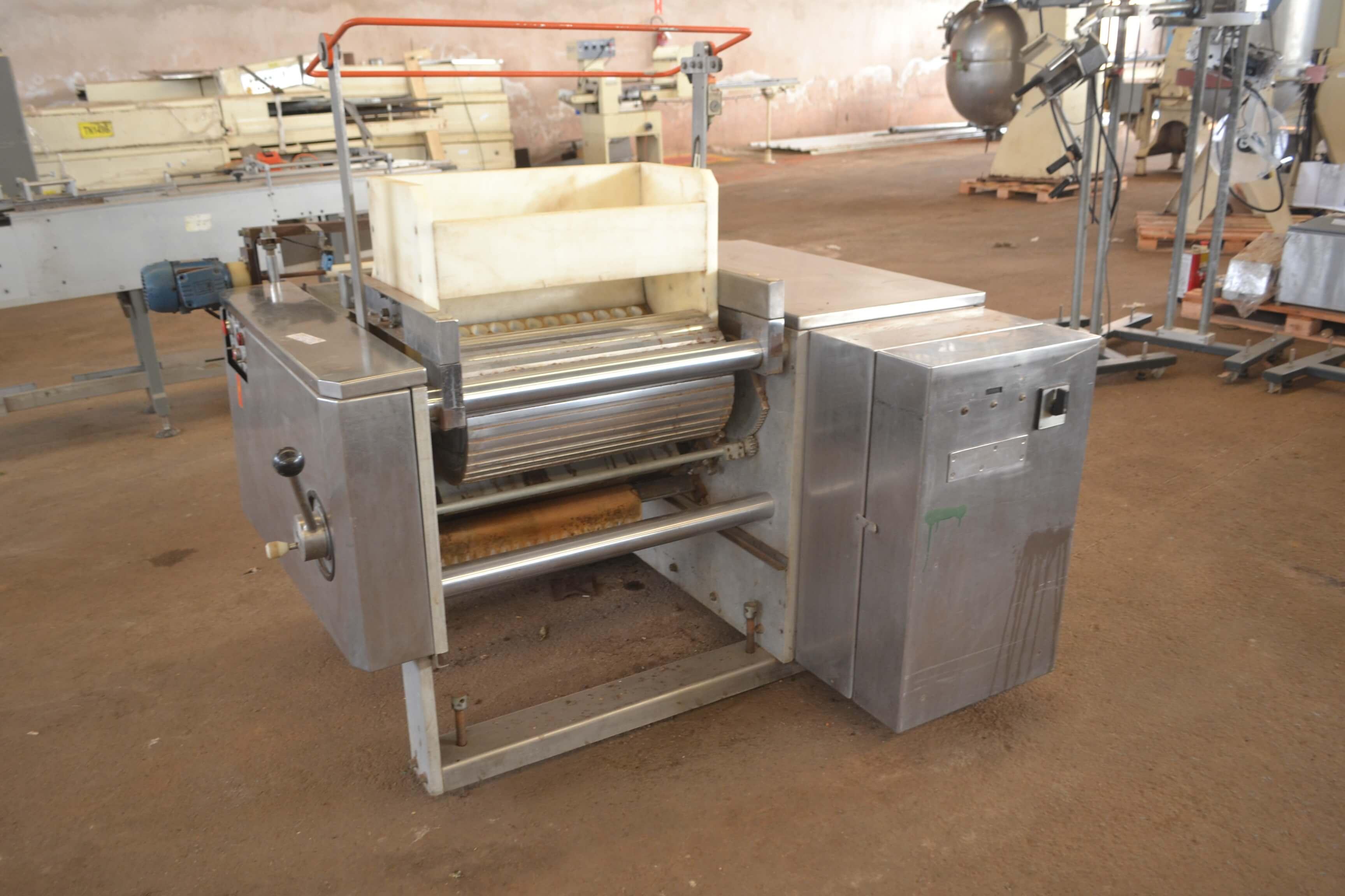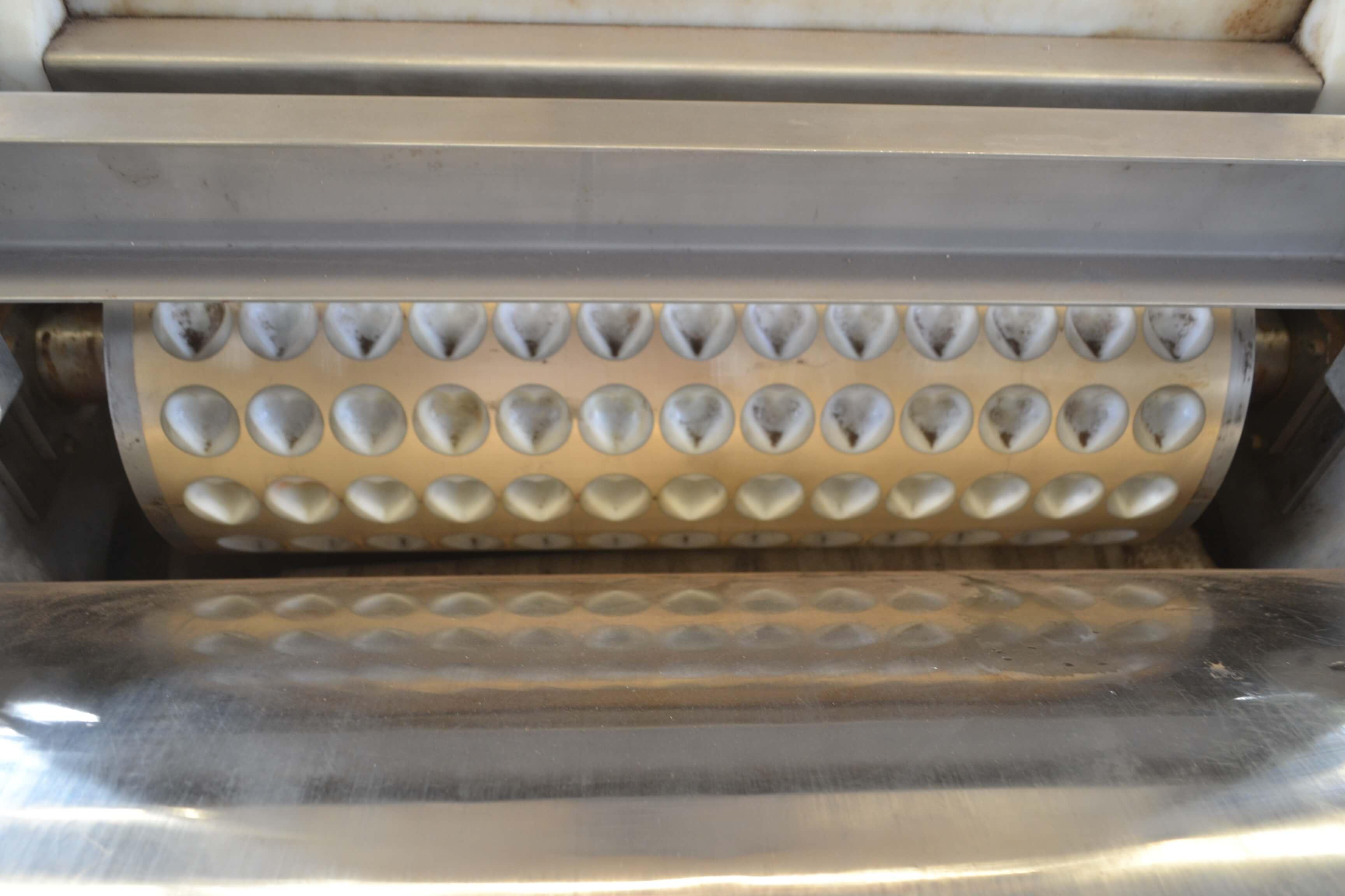 Termoformadora de bombom maciço ou recheado 600 mm marca Sollich. Equipamento acompanha rolo formador em nylon com formato de coração, que pode ser substituído. Ideal para moldagem de produto maciço (compound) ou recheado (recheio + cobertura por compound). Dimensões: - Largura: 1,70 m - Comprimento: 1,65 m - Altura: 1,50 m.