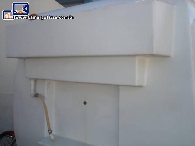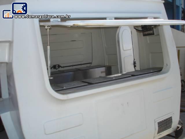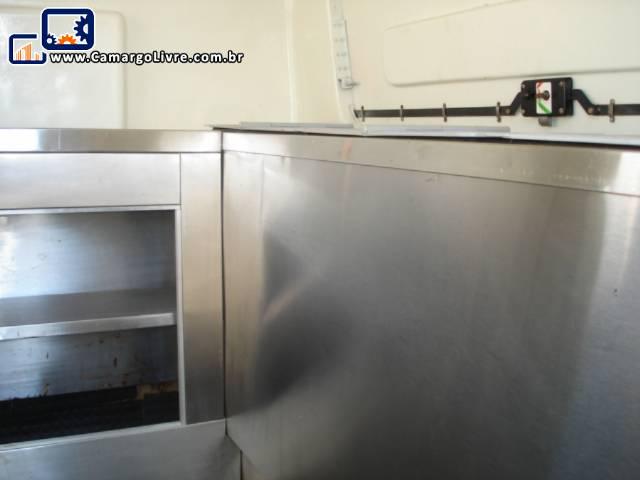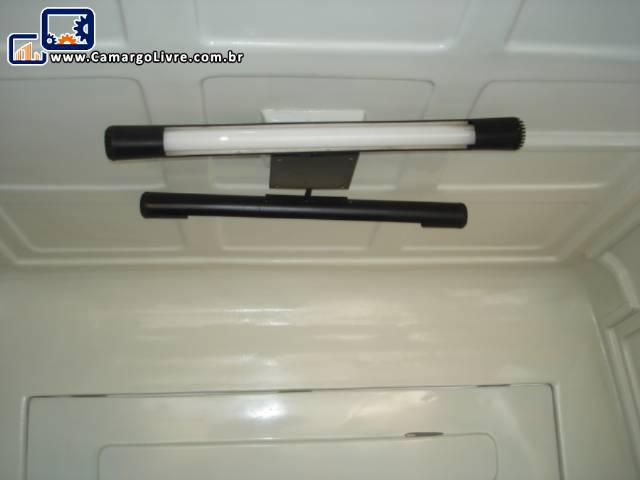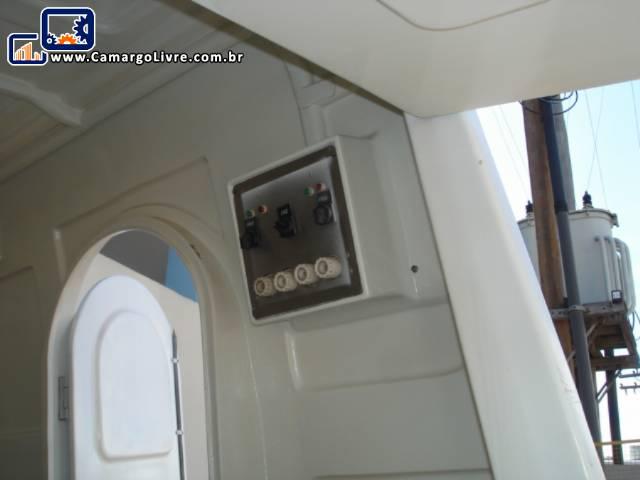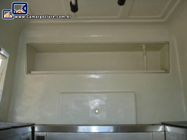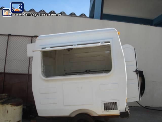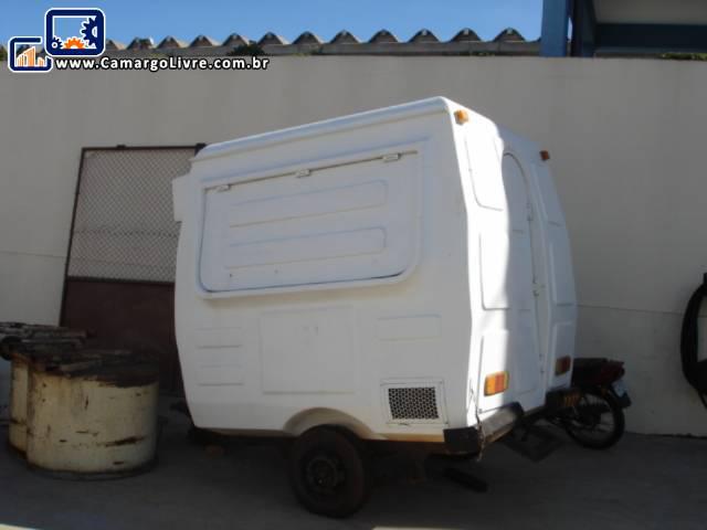 Trailer fabricado totalmente em fibra de vidro, equipado com 2 freezers com placa de congelamento, iluminação interna, reservatório de água e pia.